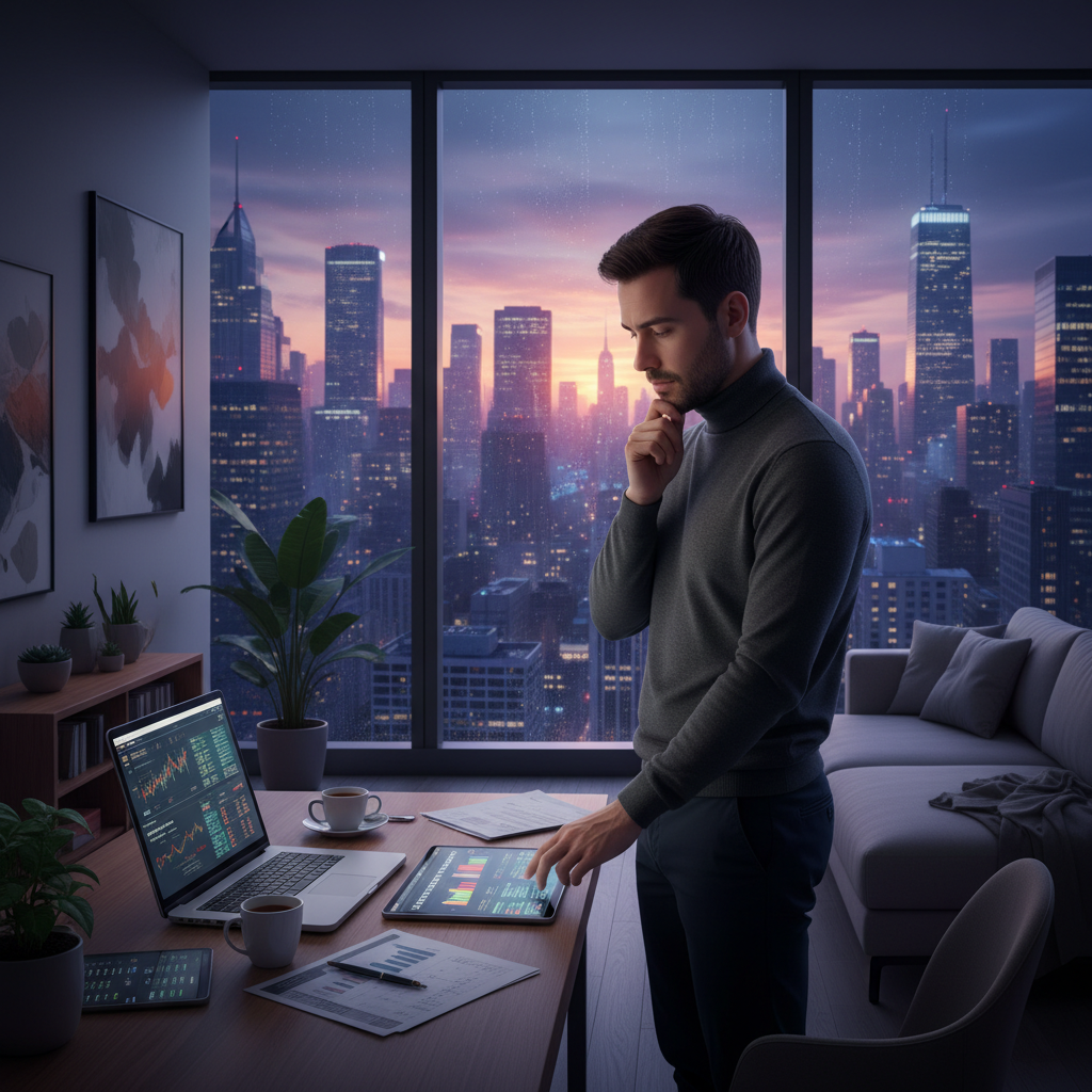 attachment; filename=Eine Person sitzt an einem Schreibtisch, umgeben von Finanzunterlagen und Taschenrechnern, sieht entschlossen aus und führt ein Telefonat.